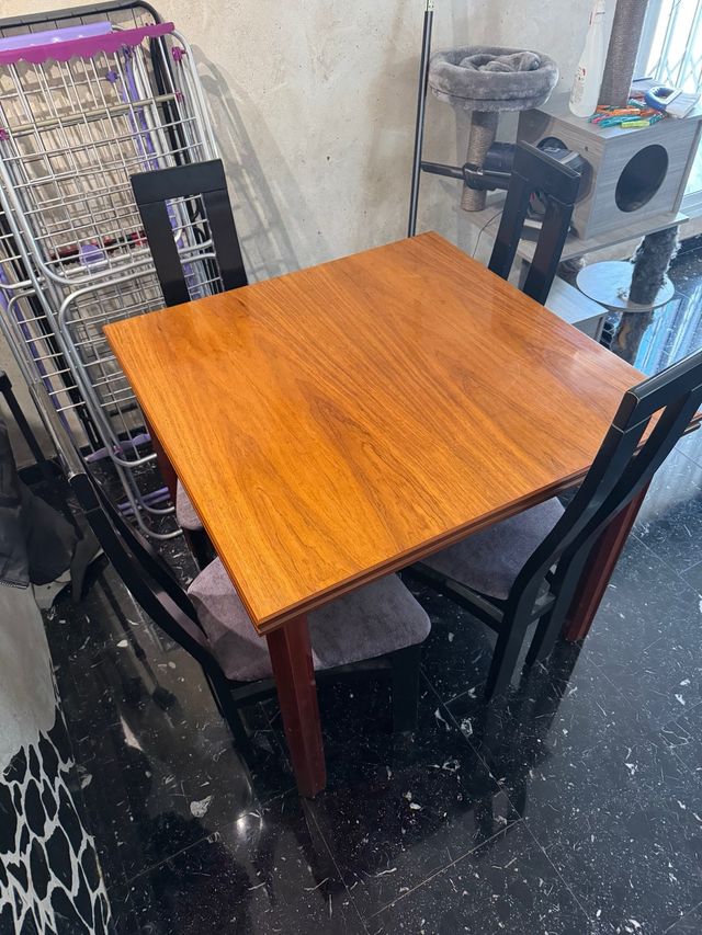 Mesa de comedor de 90*90 abatible hasta 180*90 Viene con el conjunto de 4 sillas de comedor.