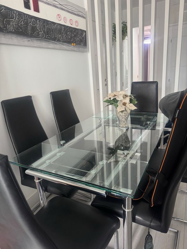 Mesa de comedor extensible de cristal y sillas 6
