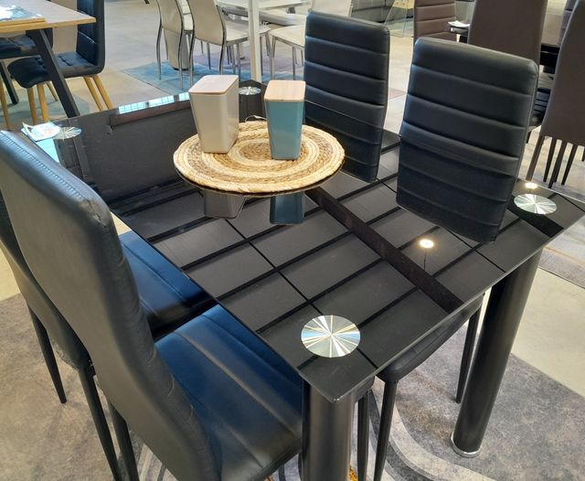 MESA Y 4 SILLAS, SALON, COMEDOR O COCINA. Mesa de 110x70cm, en cristal templado. Facil montaje. Disponible en blanco, negro o gris