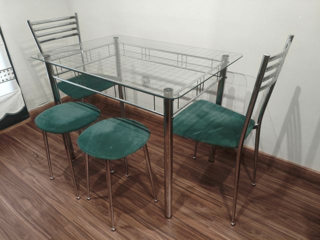 Detalles del productoConjunto de comedor con mesa de cristal y estructura metálica.