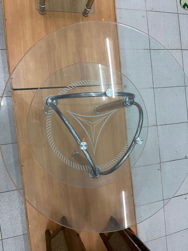 Mesa de cristal redonda con base metálica