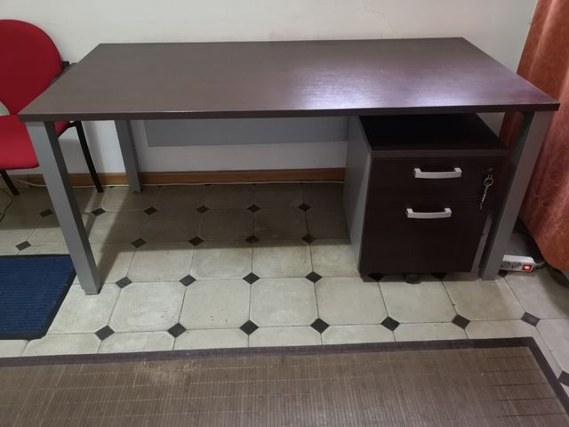 Detalles del productoMesa de despacho, de madera con patas metálicas, en buen estado. Medidas 1'60m largo, 80 cm. ancho y 73 cm. alto. Con book de dos cajones, el de abajo hondo, con guías para fichero. 50x44x58, con ruedas, como nuevo. Todo por 200€. A recoger en Sabadell Nord.