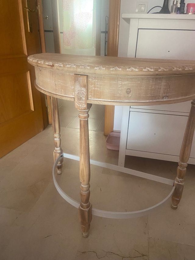 Detalles del productomesa de madera natural con detalles labrados y metal pintado en blanco, nueva sin estrenar . Medidas del producto