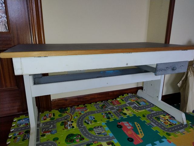 Detalles del productoMesa de escritorio regulable en altura y con mecanismo para inclinar el escritorio, se desconoce si funciona, tiene un cajón, un pequeño borde de madera y un cajon alargado por debajo de la mesa. Tiene las esquinas redondeadas. Medida del tablero de la mesa 50x110. Para renovar o reparar.