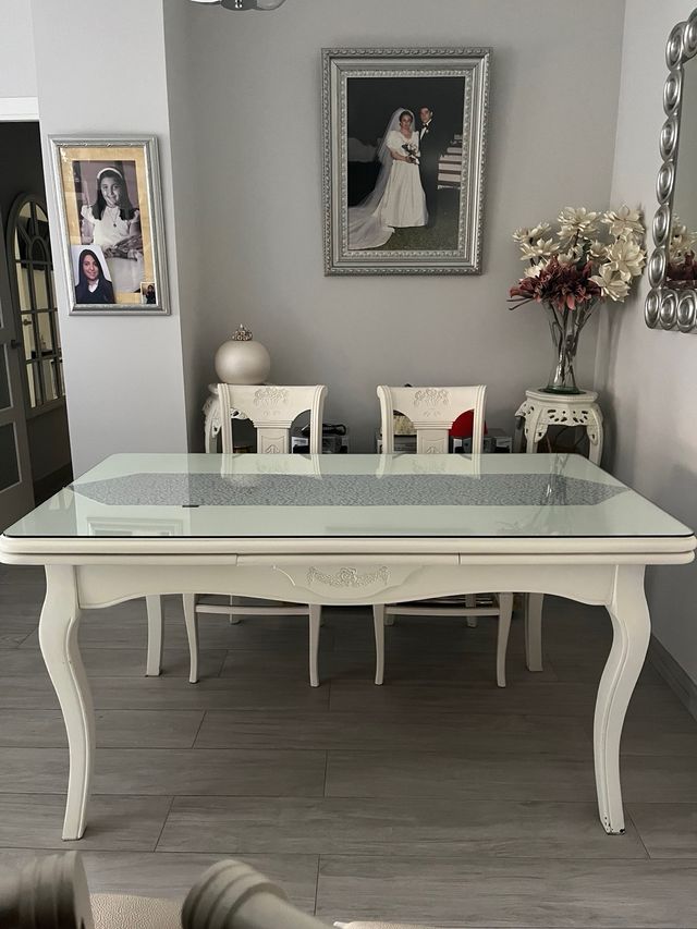 Detalles del productomesa madera blanca extensible con un dibujo tallado en la mesa y cuatro silla con el mismo dibujo tallado y los asientos de polipiel Medidas del producto