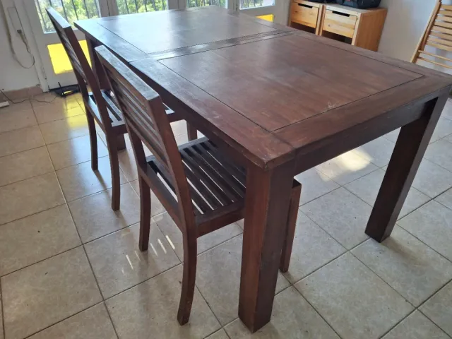 Detalles del productoConjunto de comedor de madera oscura, ideal para espacios acogedores, solo la mesa costo mas de 1.500 euros, se recoge en sant cebria de vallalta.