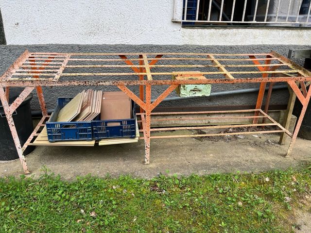 Detalles del productoMesa de metal con un diseño industrial, ideal para exhibir o trabajar con productos.