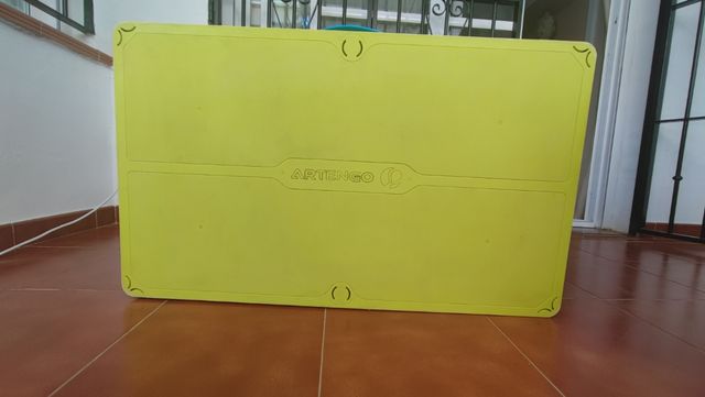Detalles del productoMesa de pin-pon de la marca Artengo. Con dos palas y su pelota. Se pliega y se guarda tipo maleta. Medidas 92 cm largo, ancho 55cm, alto 57,5 pero sus patas son extensibles hasta 18 cm más.