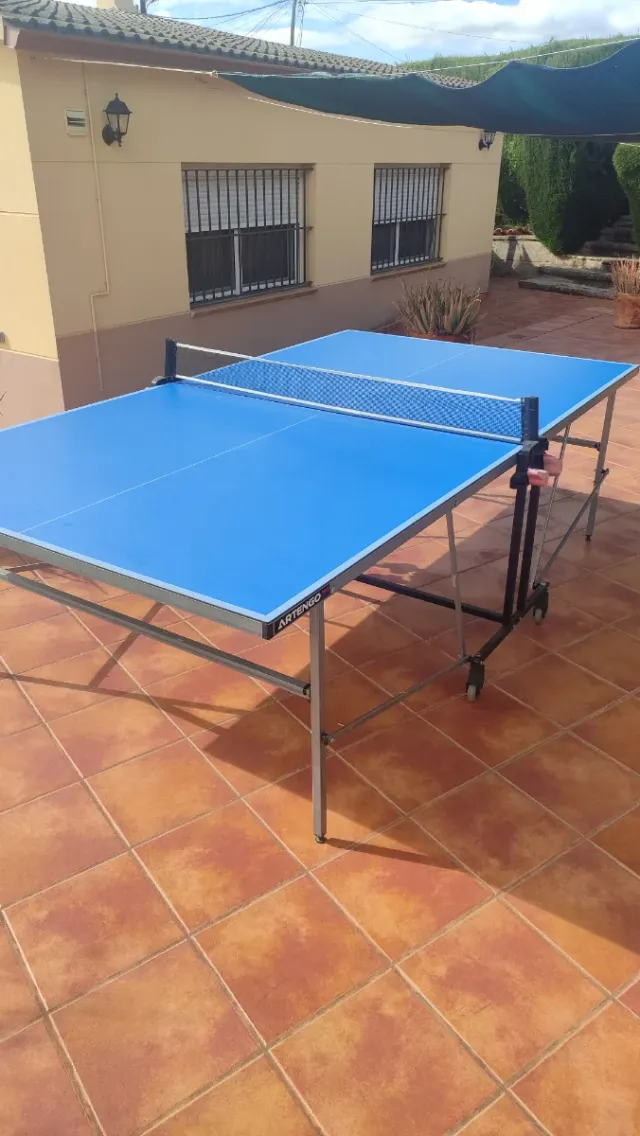 Detalles del productoMesa de ping pong de color azul. Se pliega fácilmente para guardarla.