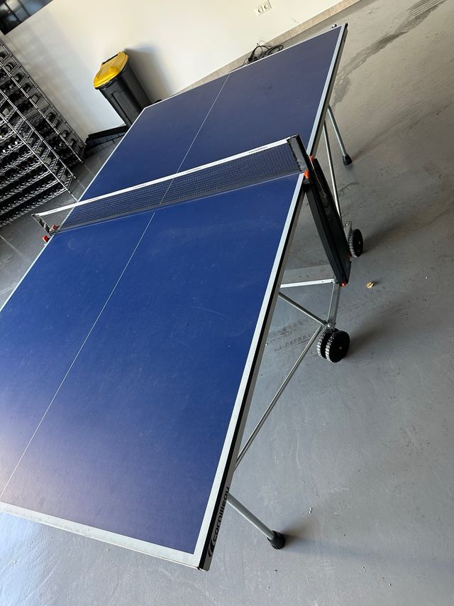 Detalles del productoMesa de ping pong de color azul, ideal para jugar en interiores o exteriores.