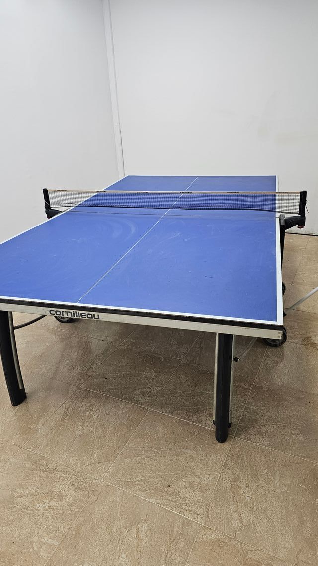 Mesa de ping pong de color azul, marca Cornilleau. Ideal para jugar en interiores o exteriores. - Superficie de juego azul. - Patas negras plegables. - Red incluida.
