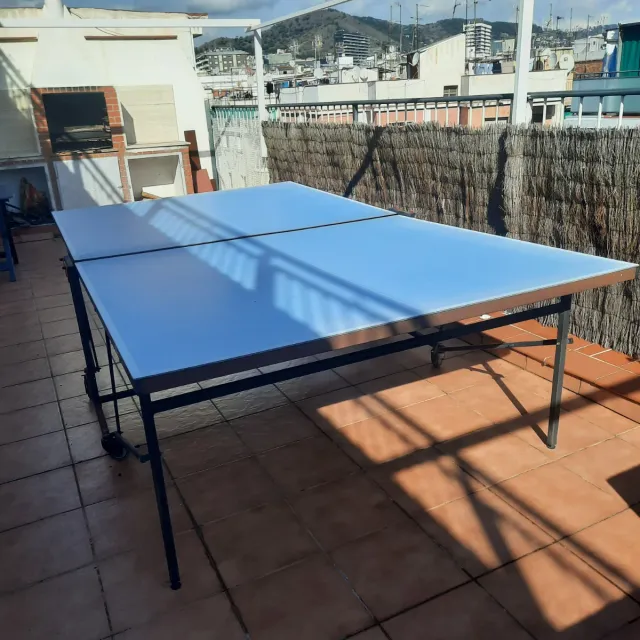Detalles del productoMesa de ping pong con superficie azul, ideal para disfrutar en exteriores.