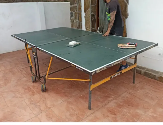 Detalles del productoMesa de ping pong verde con patas plegables y ruedas para facilitar su transporte. Ideal para jugar en exteriores.