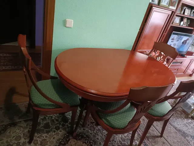 Detalles del productoConjunto de mesa de salón ovalada con 6 sillas a juego en la foto sale 4 pero hay 2 mas . Ideal para comedor o sala de estar. ( Es extensible) Como nuevo sin usar casi