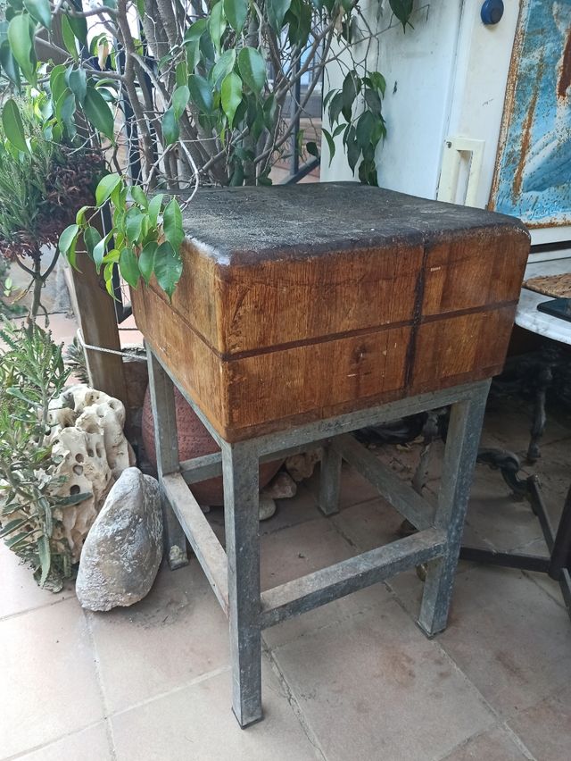 Bloque macizo de madera. Mesa de trabajo con pié de hierro