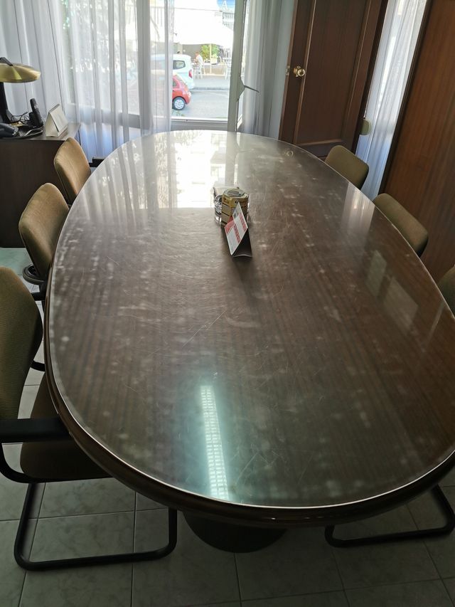 Detalles del productoMesa de reuniones de madera maciza ovalada. Está soportada por dos grandes columnas cilíndricas también de madera maciza. Son necesarias varias personas para transportarla debido a su gran peso. Protegida por una lámina de metacrilato. Recogida local. Medidas del producto