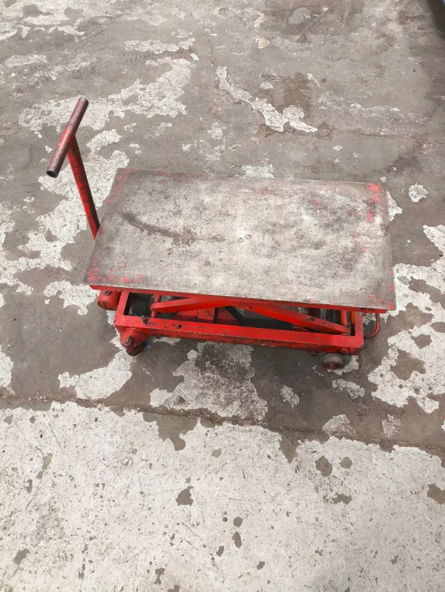 Detalles del productoMesa elevadora de tijera en color rojo, ideal para trabajos con motores. Su diseño permite ajustar la altura de forma sencilla.