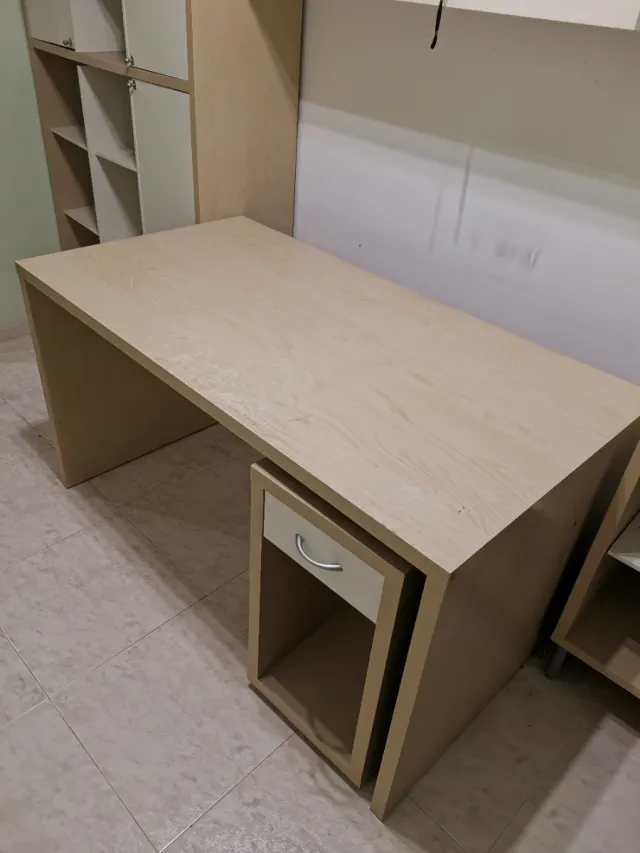Mesa escritorio con cajón beige y blanco