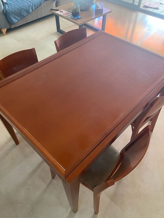 Detalles del productoConjunto de mesa de comedor extensible y cuatro sillas. La mesa es de madera color marrón, con un diseño sencillo y elegante. Las sillas son del mismo color y material, con asientos acolchados.