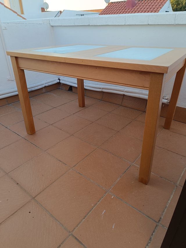 Detalles del productoConjunto de mesa de comedor extensible y cuatro sillas. La mesa es de madera clara y tiene una superficie de cristal. Las sillas también son de madera, con un diseño sencillo y elegante, y tienen asientos acolchados de color marrón oscuro. Se encuentran en buen estado. - Mesa extensible de madera.