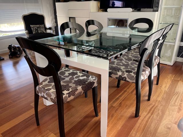 Detalles del productomesa extensible de vidrio laminar de Camino a Casa. Seis sillas lacadas en negro muy comodas Medidas del producto