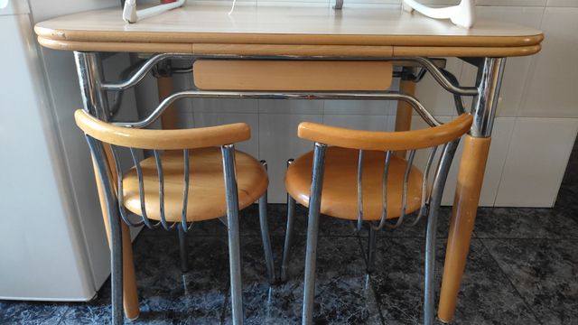 Detalles del productoConjunto de mesa extensible para cocina con dos taburetes.