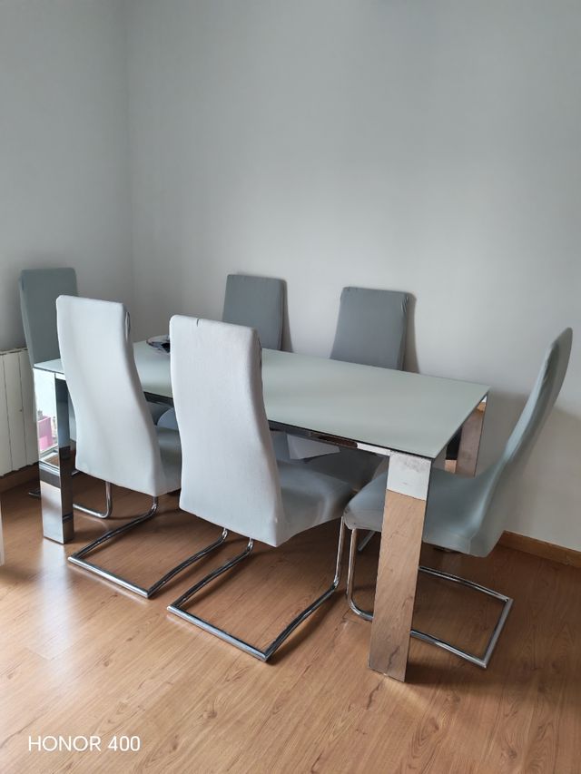 Conjunto de mesa extensible con superficie de cristal templado y seis sillas.