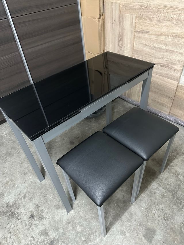 Detalles del productoConjunto de mesa extensible con superficie de cristal negro y dos asientos.