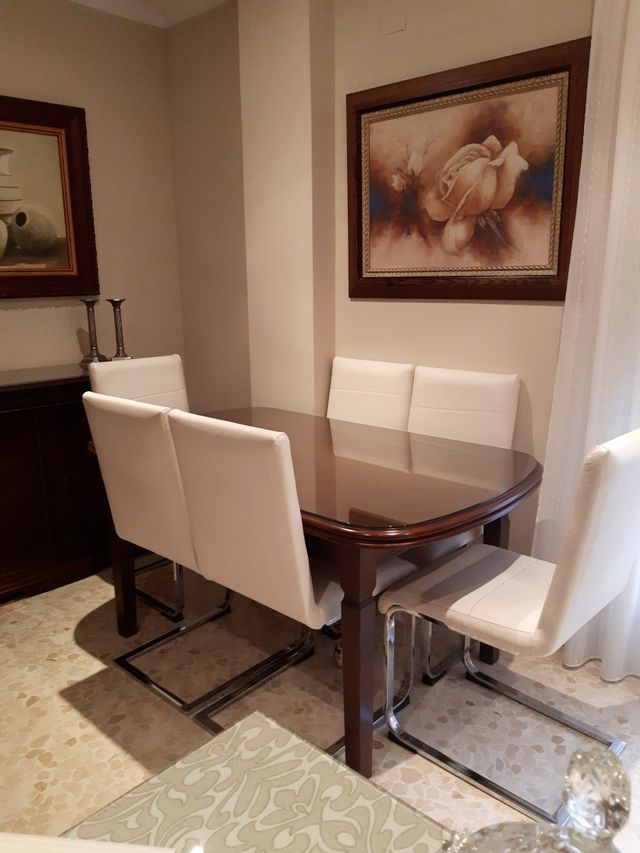Mesa extensible de 15o,cristal y 6 sillas madera