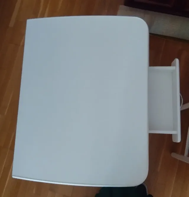 Detalles del productoMesa de cocina blanca con un práctico cajón.