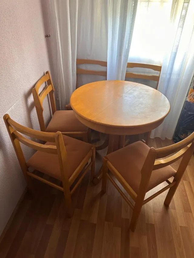 Conjunto de mesa extensible de madera con cinco sillas a juego. Ideal para comedor o cocina. - Mesa redonda extensible. - Sillas con asiento tapizado.