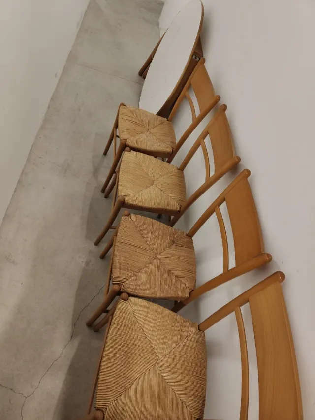 Mesa extensible madera 4-6 personas, con 4 sillas.