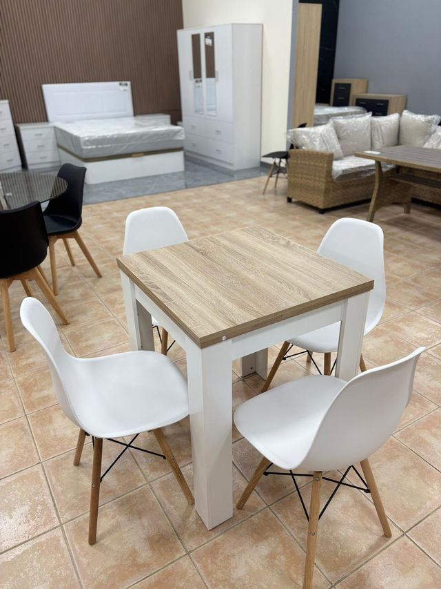 Mesa extensible madera y 4 sillas blancas