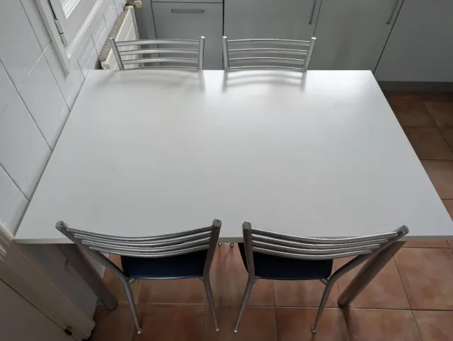 Detalles del productoConjunto de mesa extensible (60€) con cuatro sillas (25 €).