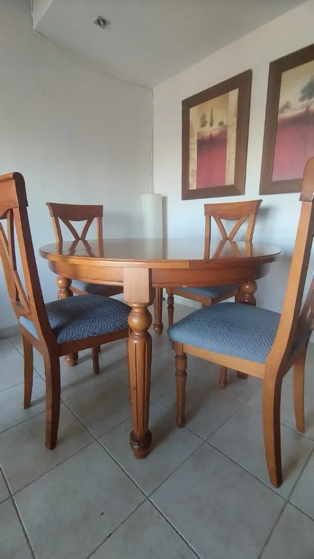 Detalles del productoConjunto de comedor con mesa ovalada extensible y 4 sillas de madera maciza.