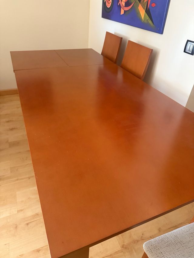 Detalles del productoConjunto de mesa de salón extensible y elevable junto con seis sillas.