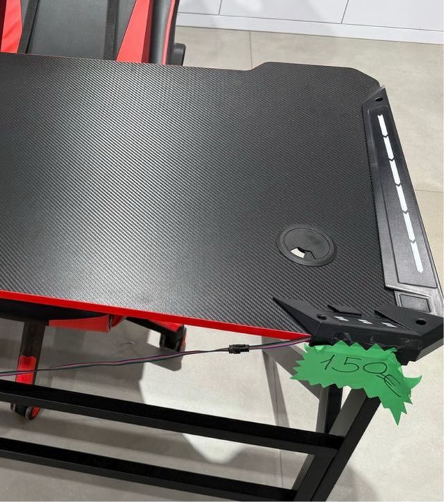 Detalles del productoMesa de gaming con un diseño moderno y detalles en rojo. Su superficie tiene un acabado texturizado que le da un aspecto único.