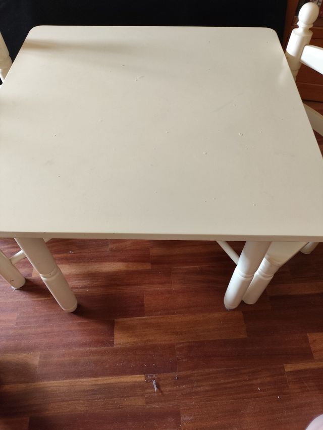 Detalles del productoConjunto de mesa y dos sillas para niñ@s, ideal para jugar o comer. La mesa es cuadrada y de color blanco roto; las sillas son del mismo color y estilo. Se encuentran en buen estado, con algunas marcas de uso mínimas.