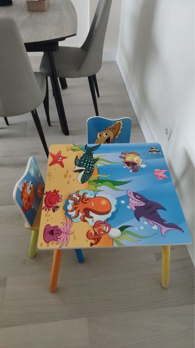 Mesa infantil con 2 sillas de animales marinos