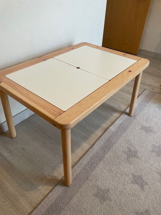 Detalles del productoMesa de madera clara con superficie de tablero en dos tonos crema. Ideal para actividades infantiles.