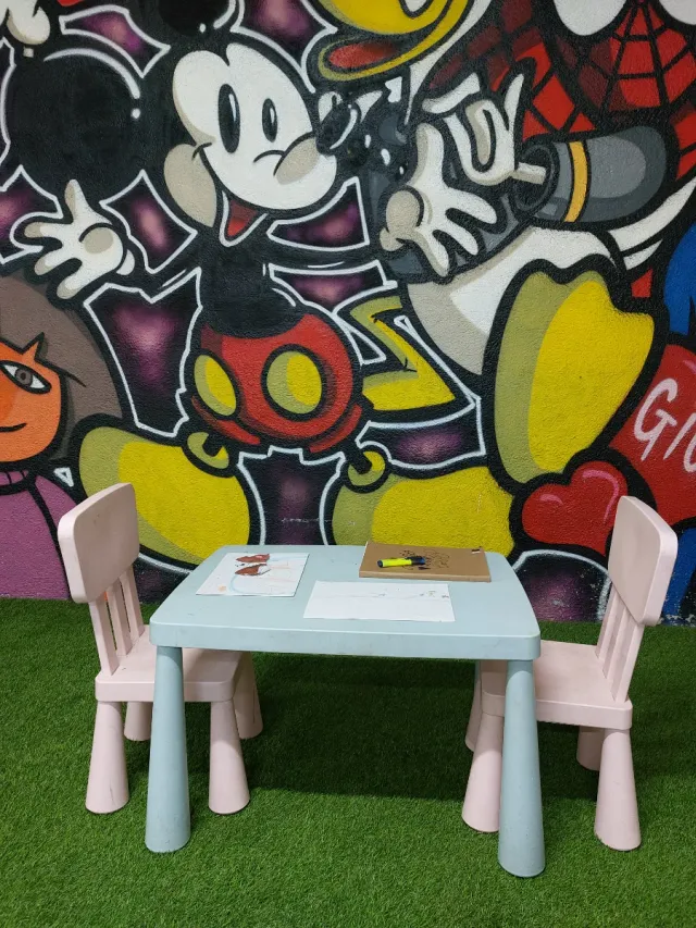 Detalles del productoConjunto de mesa y dos taburetes infantiles de plástico.