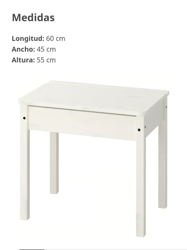 Detalles del productoMesa infantil de madera en color blanco, ideal para habitaciones infantiles o zonas de juego. Sus dimensiones la hacen práctica y fácil de integrar en cualquier espacio.Nueva costó 69€.esta bastante rebajada para como está de uso.