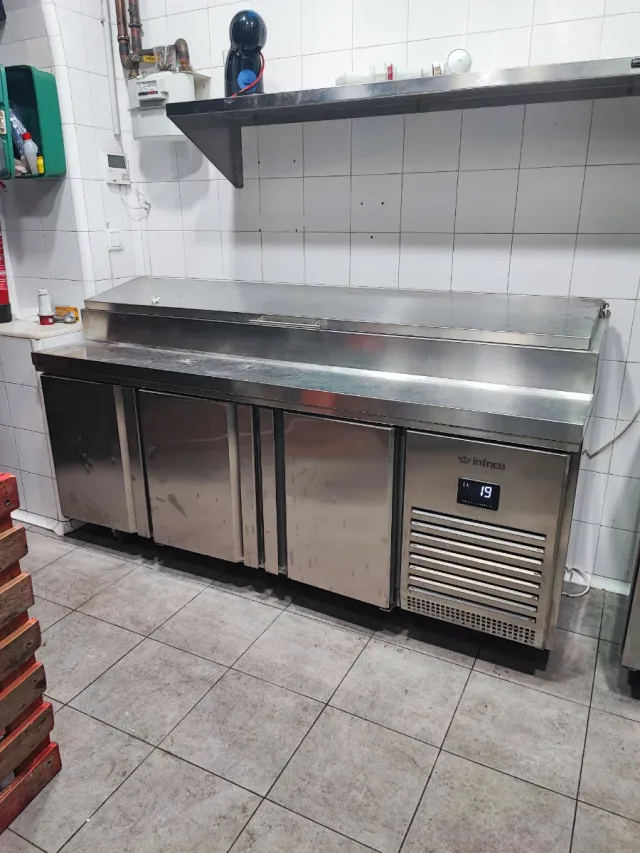 Detalles del productoMesa refrigerada de acero inoxidable Infrico, ideal para la conservación de ingredientes en cocinas profesionales.