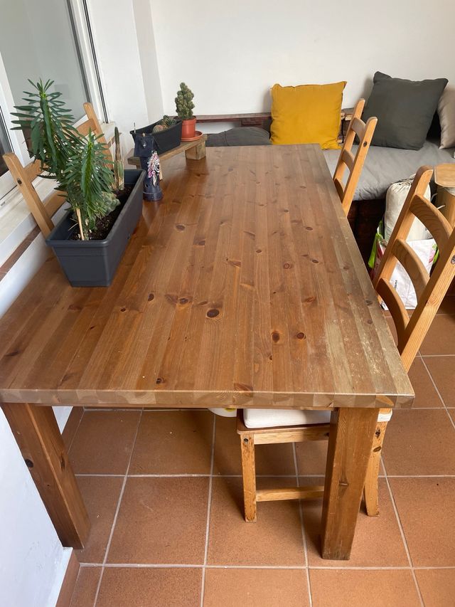 Mesa de madera maciza con cuatro sillas a juego. La mesa tiene un bonito tono marrón y está en buen estado, aunque presenta algunas marcas de uso. Ideal para terraza.