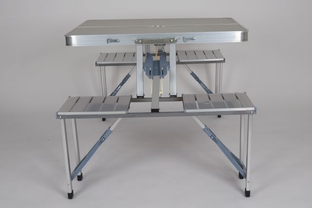 Práctica mesa maleta metálica que se pliega fácilmente para su transporte y almacenamiento. Incluye sillas integradas.