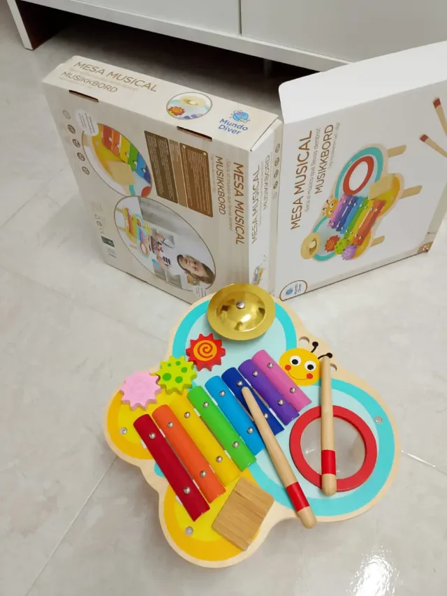 Mesa musical de madera con diseño de mariposa. - Xilófono de 8 notas de colores. - Tambor. - Platillo. - Engranajes. - Baquetas incluidas.