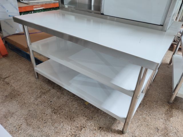 Detalles del productoMESA nueva de acero inoxidable de 1,5M con dos baldas y patas regulables.