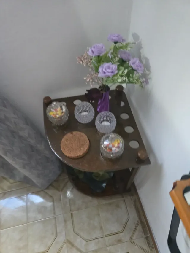 Mesa auxiliar con diseño de esquina. - Acabado en madera oscura. - Superficie con orificios. - Ideal para colocar los tacos y bolas de billar