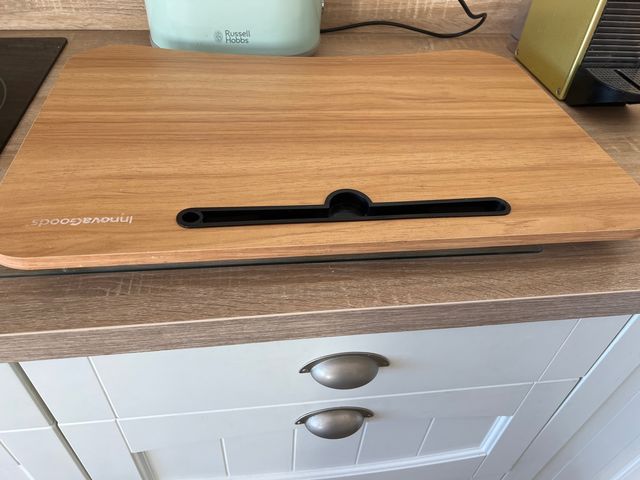 Mesa portátil de madera con diseño moderno. - Superficie de madera con acabado natural. - Ranura negra para soporte. - Patas plegables para fácil almacenamiento.
