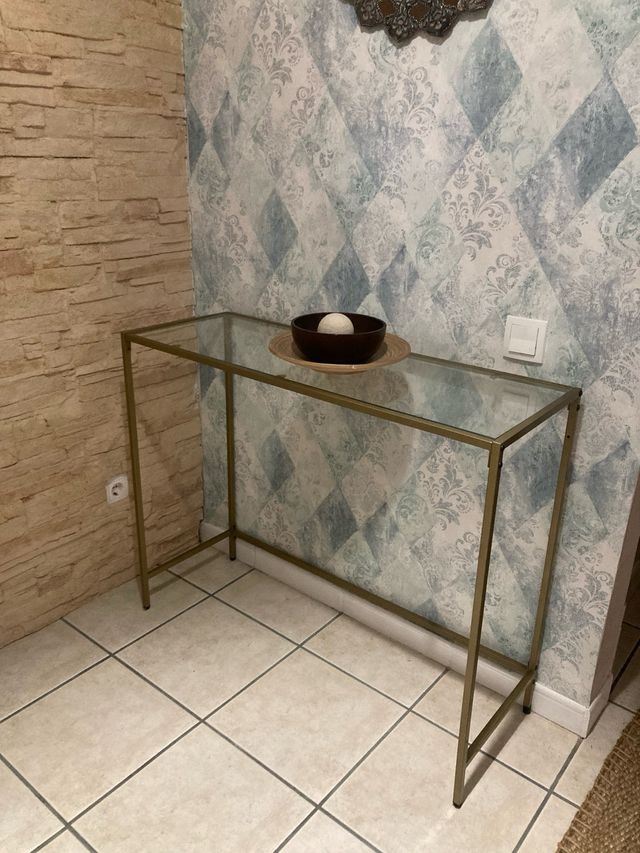 Mesa recibidor cristal y metal dorado